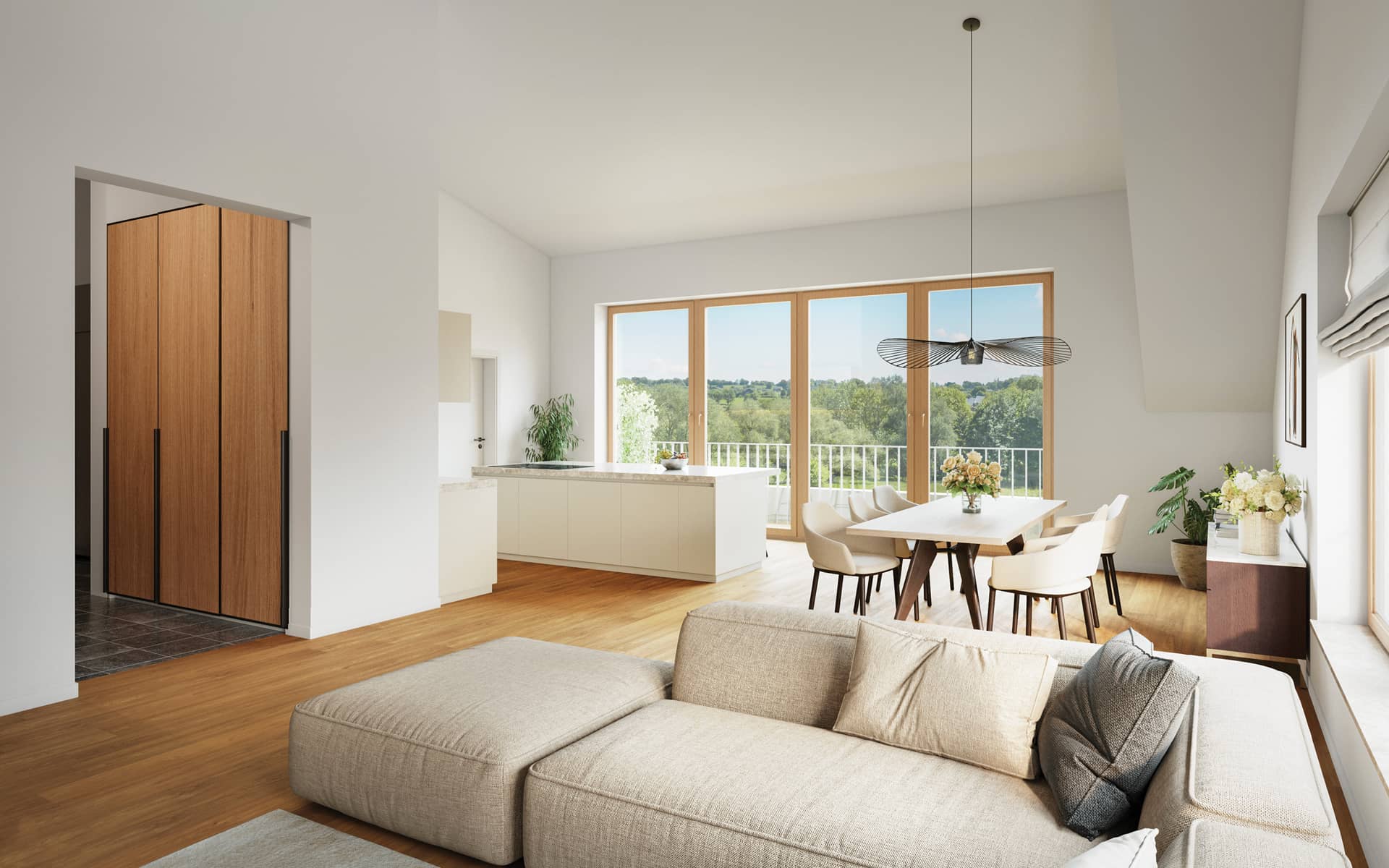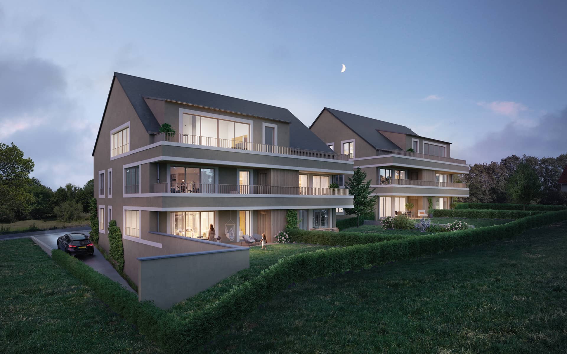Chaque lieu de vie entretient un lien étroit avec la nature environnante, que ce soit par les vues ouvertes par les grandes surfaces vitrées, l’apport de lumière extérieure, ou par les agréables espaces extérieurs, terrasses et jardins.